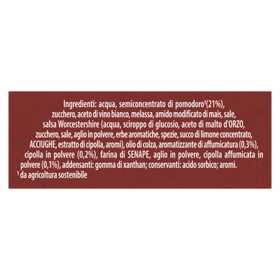 acqua, semiconcentrato di pomodoro (21%), zucchero, aceto di vino bianco, melassa, amido modificato di mais, sale, salsa Worcestershire (acqua, sciroppo di glucosio, aceto di malto d'ORZO, zucchero, sale, aglio in polvere, erbe aromatiche, spezie, succo di limone concentrato, ACCIUGHE, estratto di cipolla, aromi), olio di colza, aromatizzante di affumicatura (0,3%), cipolla in polvere (0,2%), farina di SENAPE, aglio in polvere, cipolla affumicata in polvere (0,1%), addensanti: gomma di xanthan; conservanti: acido sorbico; aromi.