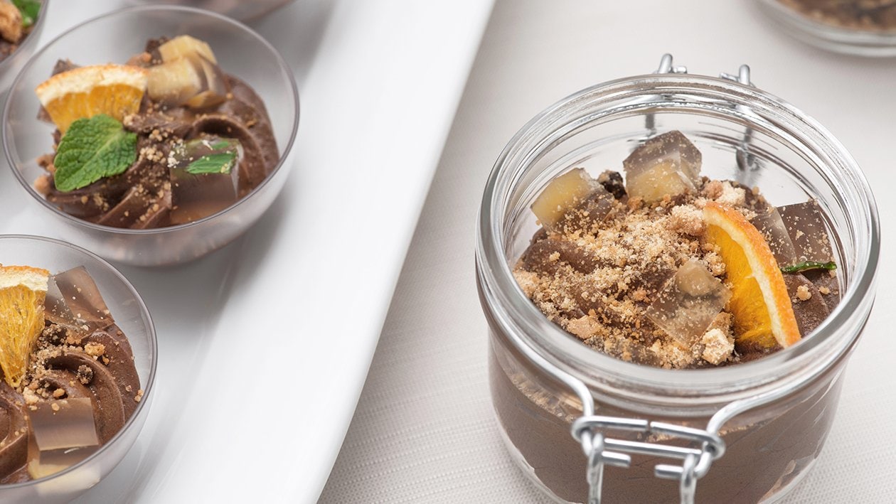 Mousse al cioccolato con gelee’ di zenzero e crumble di nocciole